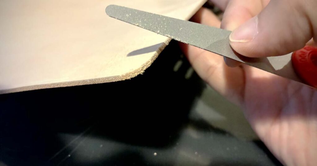 裁断後のエッジが鋭すぎたため、ドレッサー(ヤスリ)で角を落としましたが、均一な美しさを出すためには「ヘリ落とし」の導入が急務であると痛感しました。