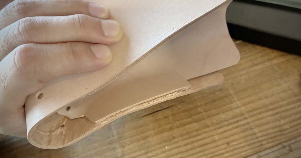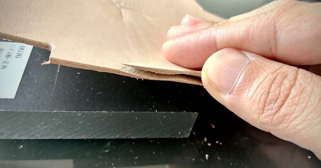 側面パーツを縫い合わせる際、硬いヌメ革がどうしても曲がらず、裏側を削る「漉き(すき)」を敢行しました。