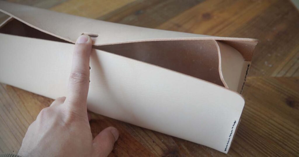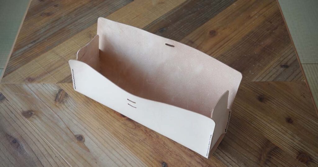 結局、革の弾性が強すぎて、指で押さえないと蓋が閉まらないという状態に。 本来付けるべきベルトも、この硬さでは機能しないと判断し、今回はオープンな工具入れとして完結させることにしました。