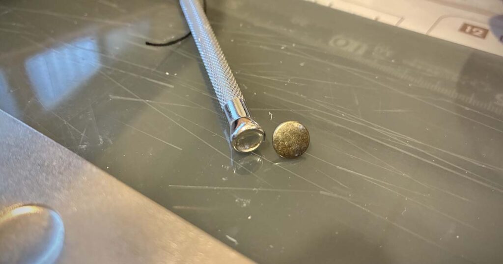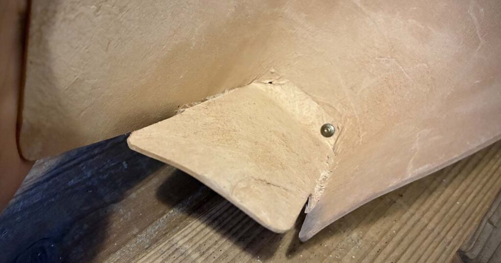 しかし、加減を誤り、刃が表面まで貫通するという痛恨のミス。 さらにカシメ打ちでも棒のサイズ選択を誤り、歪みが生じてしまいました。 道具とパーツの「正しい組み合わせ」の重要性を、身をもって学びました。漉き方も勉強が必要ですね